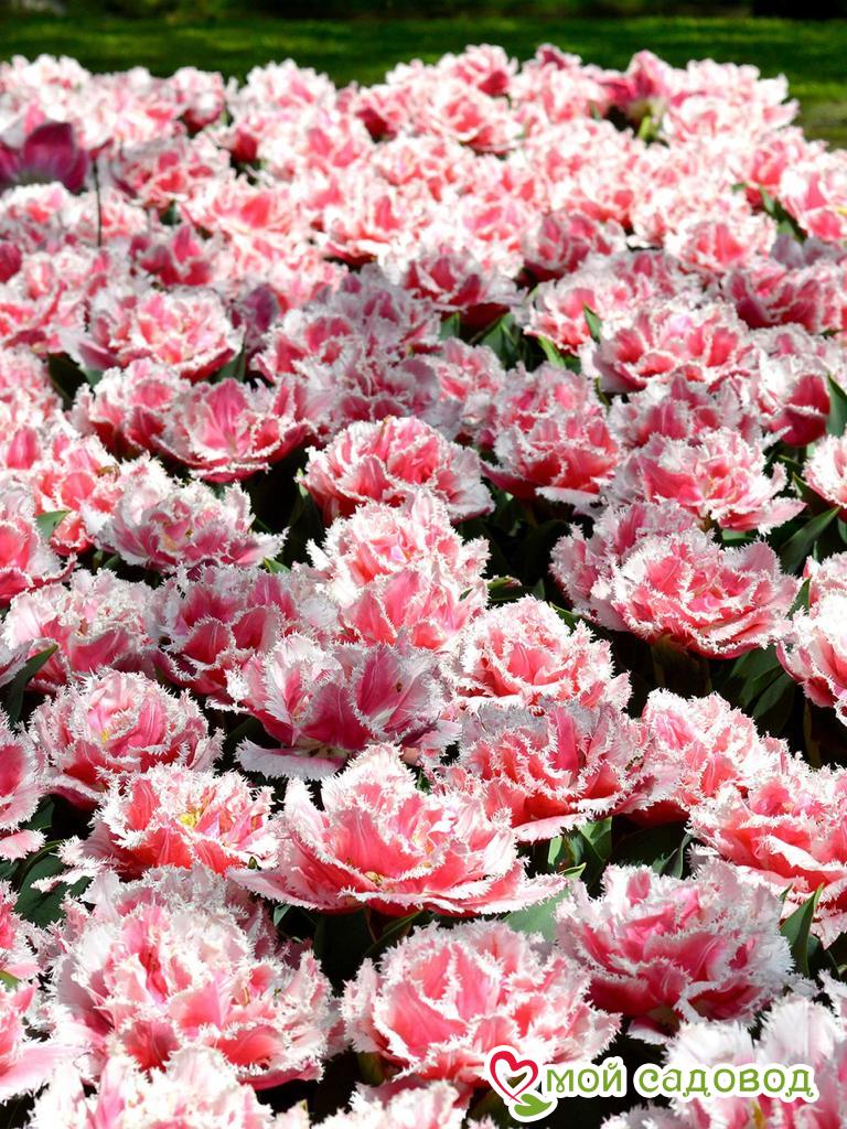 Тюльпан Квинсленд относится к бахромчатым сортам. Цветет тюльпан Квинсленд в апреле — начале мая, образуя высокий, 6-8 см нежно-розовый с шикарной белой бахрамой бутон. Отличительная особенность этих тюльпанов — игольчатая бахрома по краям лепестков, напоминающая иней. Форма цветка различная, неповторимая. Обладает тюльпан Квинсленд средней скоростью роста, подходит как для озеленения и украшения клумб, так и для букетов. Красивый бело-розовый цветок образуется на прочной ноге высотой 20-30 см. Легко размножается, дает прекрасную срезку.